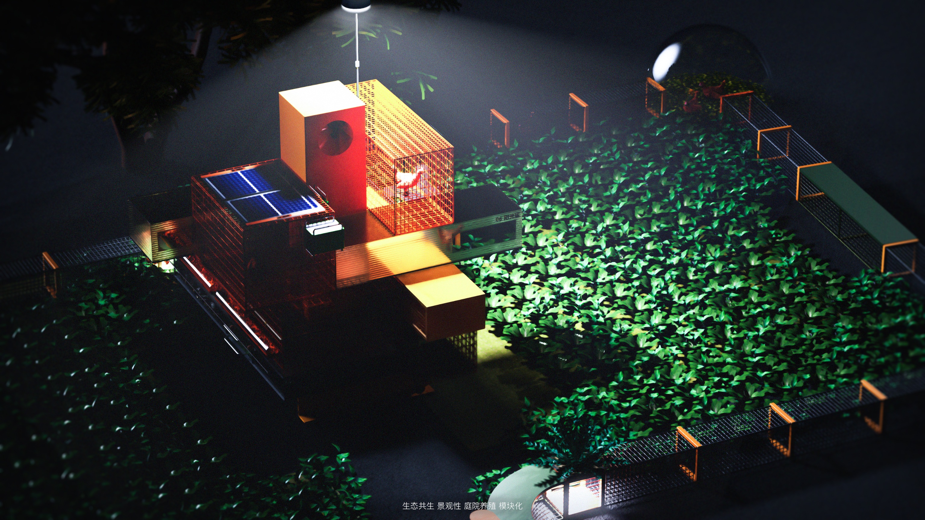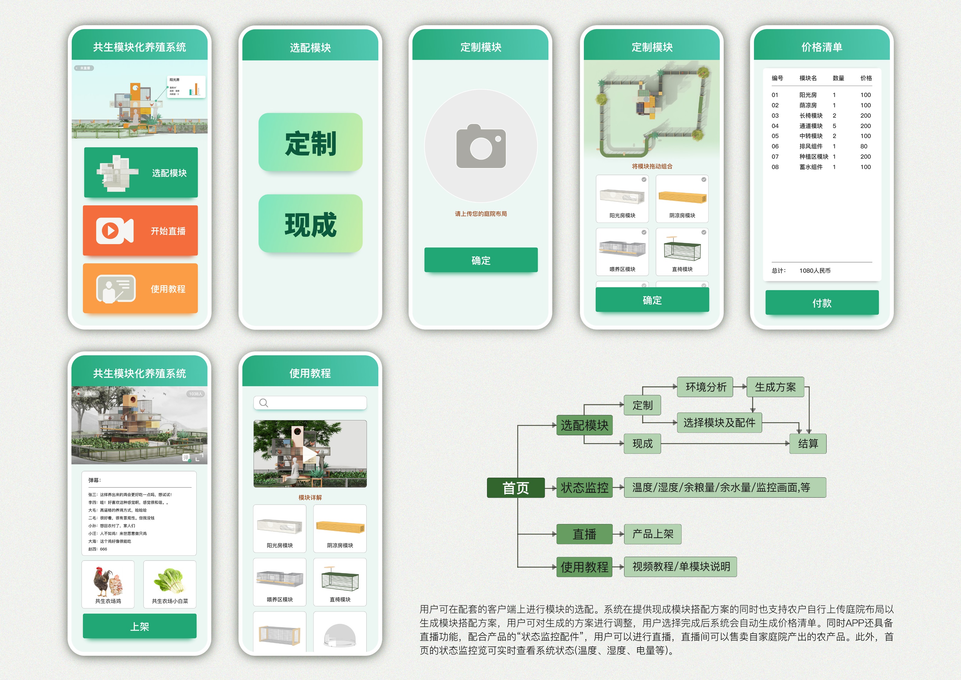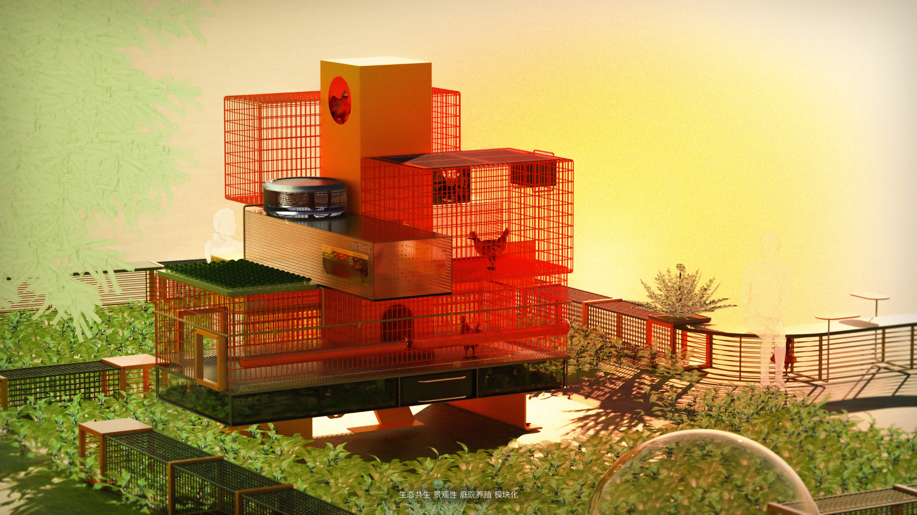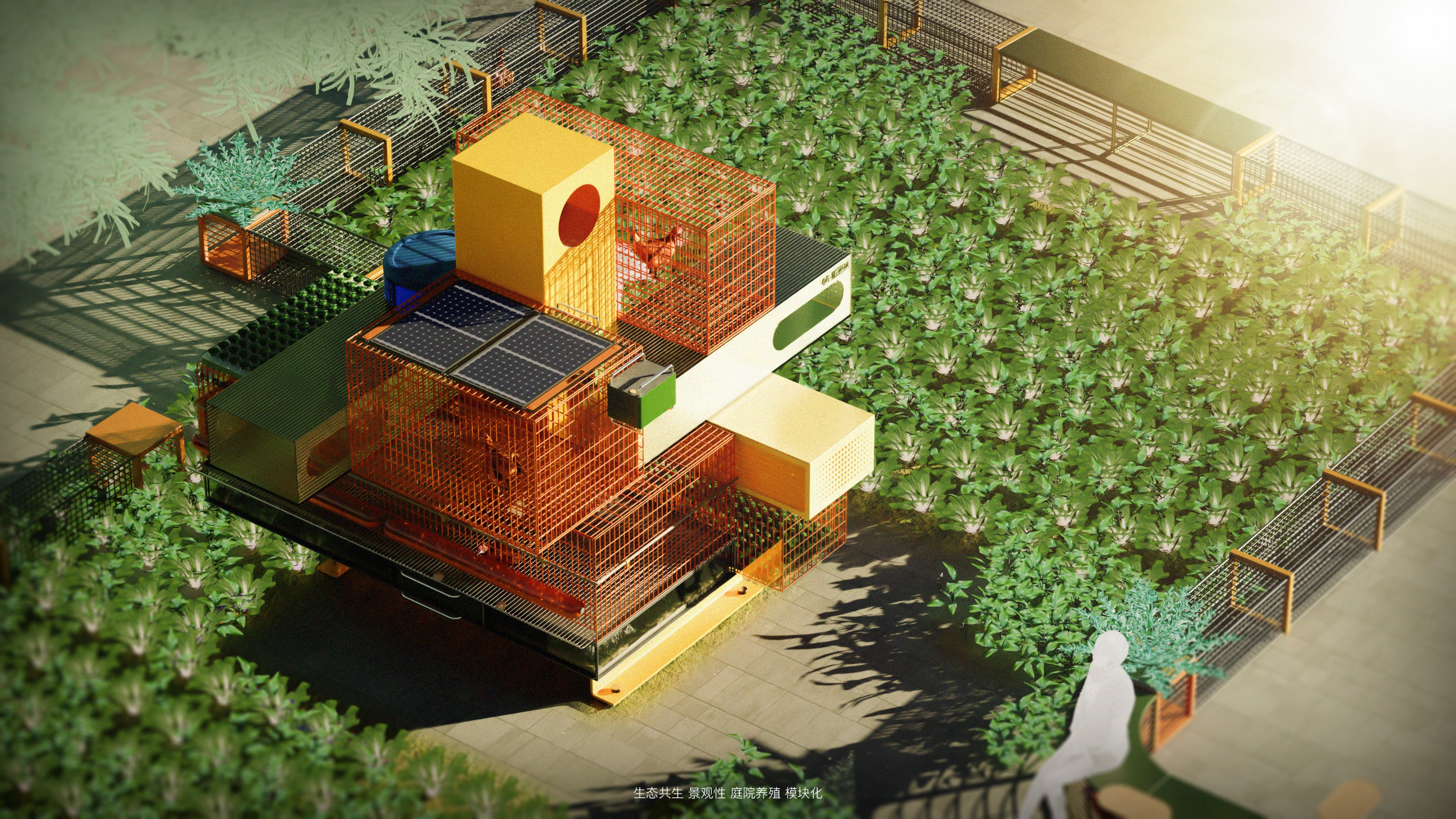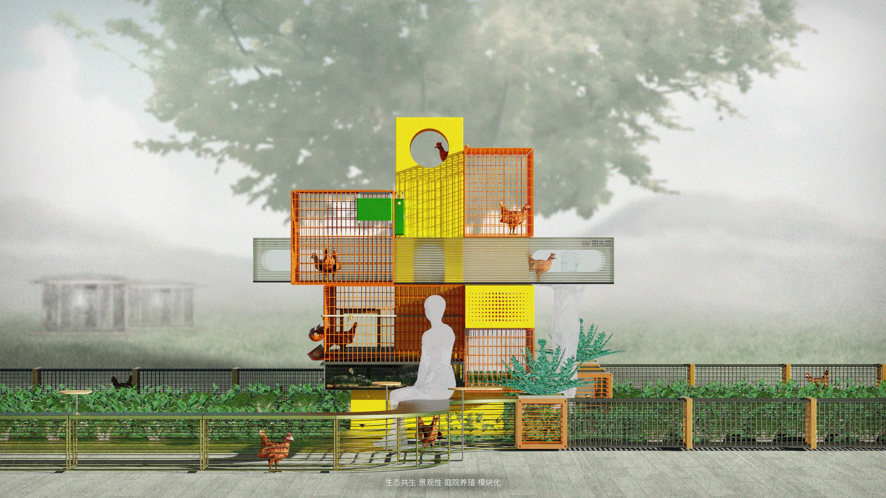 传统农村庭院养殖模式下养殖环境与人居环境不相融、缺乏完整的生态性,并且养殖空间不具备景观性,这与国家提出的美丽乡村政策不相融。本设计提出《基于共生理念的景观化养殖系统》,以模块化的视角拆分合并庭院养殖的需求,将庭院养殖系统分解为“饲养区主模块”、“种植模块”、“人栖模块”以及”通道模块“等,每个大模块下有不同的小功能模块。产品配备APP,用户可根据庭院环境采购合适的模块以组建自己的养殖系统,APP还具备直播功能,可结合养殖景观进行农产品销售。系统具备景观性和生态性,是一种小型的庭院生态系统,人和自然和谐共生,具备在地性。该系统的各个模块之间可以带来共生效益,人则是“小生态”的核心。