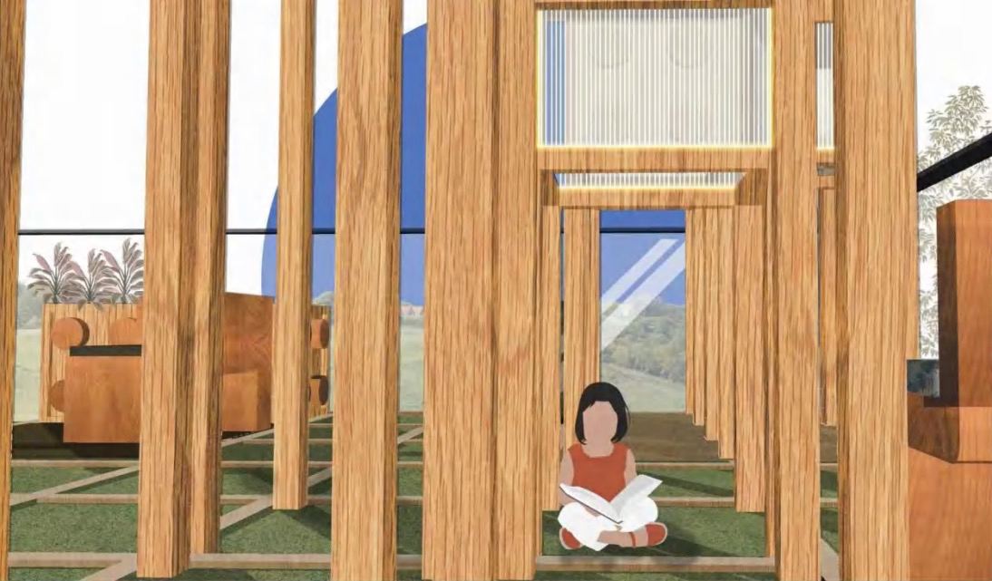 本次设计将以“太太客厅”为主题,以知识分子、建筑师群体、已有家庭女性群体,以及年轻的女性群体为主要使用人群,基于使用人群以休闲、聊天主要活动,以及儿童娱乐的需求,旨在打造新型文化社交空间、休闲轻松的社交氛围,展现女性力量和女性主义文化,在设计过程中将以基地内的露台为主要空间,利用生物质能转化的,并且利用回收的布料进行设计。基地内露台面积大约为140m2,场地内的植物种植仓主要由木条进行搭建,同时结合积木的组合拼接方式,形成模块化装置,视线相互拼接组合成不同的形式,使用带有导电丝的薄纱层,将灯带组成时钟加入其中,营造出安静、休闲、自然的社交氛围。在种植仓中,植物光合作用产生糖分,并部分进入土壤,通过土壤中的细菌将其分解,将碳导体置入土壤,吸收细菌分解糖物质释放的质子和电子,随后传导进能量收集器中,将其转化为电能,为导电丝组成的时钟供电,在绿植空间中泛出点点荧光,营造温暖、宜人的环境氛围,种植仓下的空间可以给儿童提供爬行活动的趣味性场所。座椅以立方体为主要框架,将立方体进行多次分割而得,座椅之间的相互拼接、组合,整体形成模块化设施,适应不同规模的社交环境。设施自由灵活,座椅不同宽度的座椅面可以满足一人、两人等不同人数使用,根据不同社交场合元素、社交规模和谈话空间,按照人们使用需求进行围坐,形成不同的组合块,座椅下的空间可以给宠物提供一个栖身休息的空间,整体呈现出城市多元的社交方式,让这片公共空间变得灵活,充满生气。同时发起相关的主题活动,收集人群的废弃义务、纺织品、玩具等物品,提取其中的布料,加工形成各具特色的座椅花纹,给人独特的参与感和社交感受。设计是一个化繁为简的过程,生物质能具有受自然条件限制小、可靠性高、持续性好、成本低等有点,希望通过本次设计,可以实现利用自然界植物等物质转化成能源,为“双碳”目标作出贡献,同时营造有温度、舒适放松、灵活自由的社交空间,丰富使用人群的社交活动和社交形式,给场地增添独特的活力。