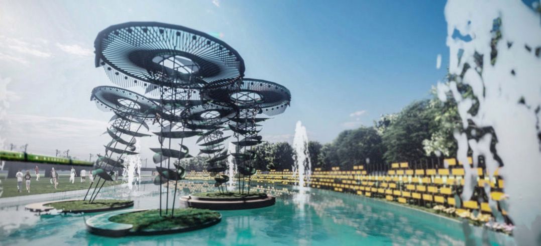 设计围绕火车运行时带来的各方面能量因素进行构思,选取风能以及声能作为装置的运行能源供给,以风能装置与声能装置在场地内进行组合,形成一个铁路旁的大型线性组合式水景观,且因为多功能装置的组合式设计,使该装置无论白天还是夜晚,都具有艺术观赏性,可供参观者全天候游玩。