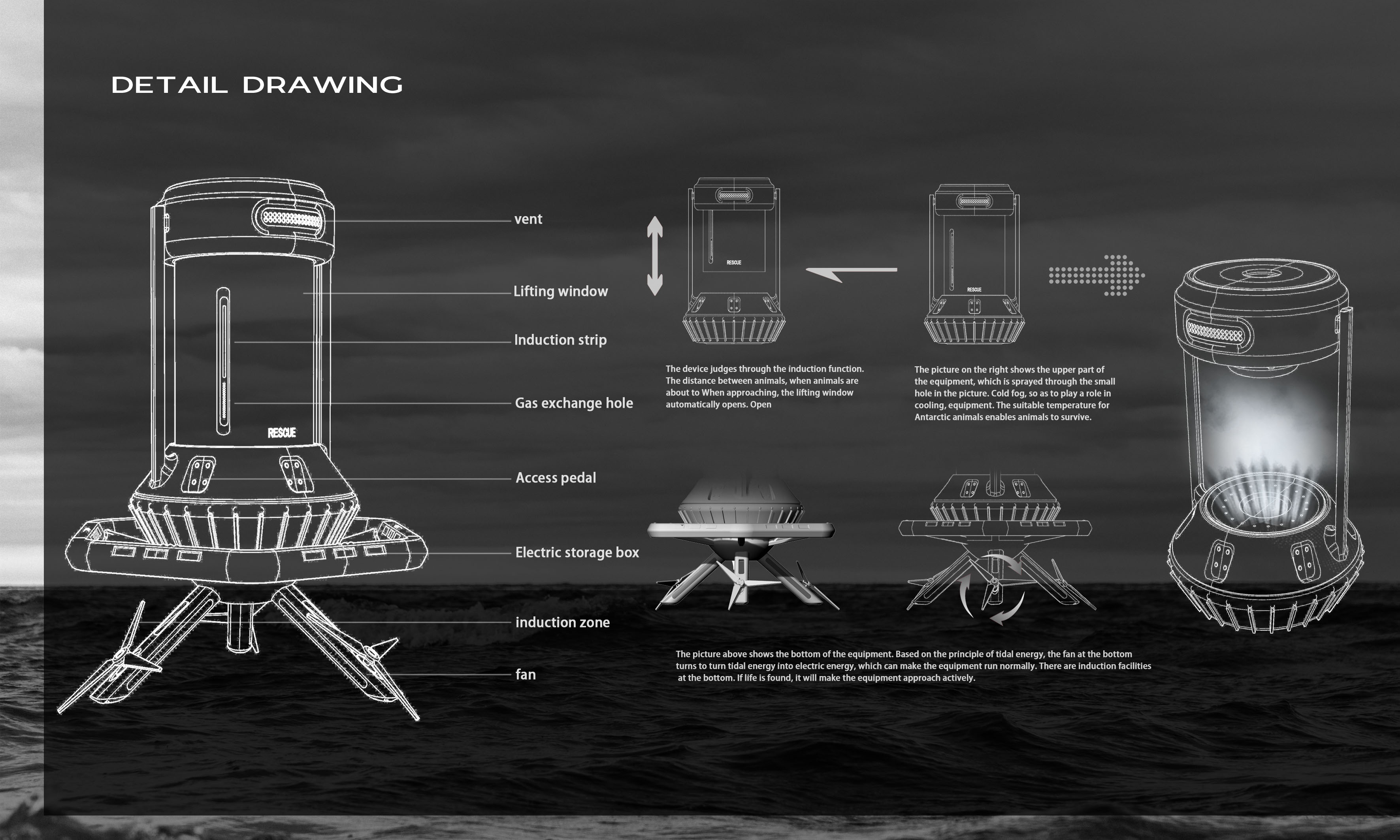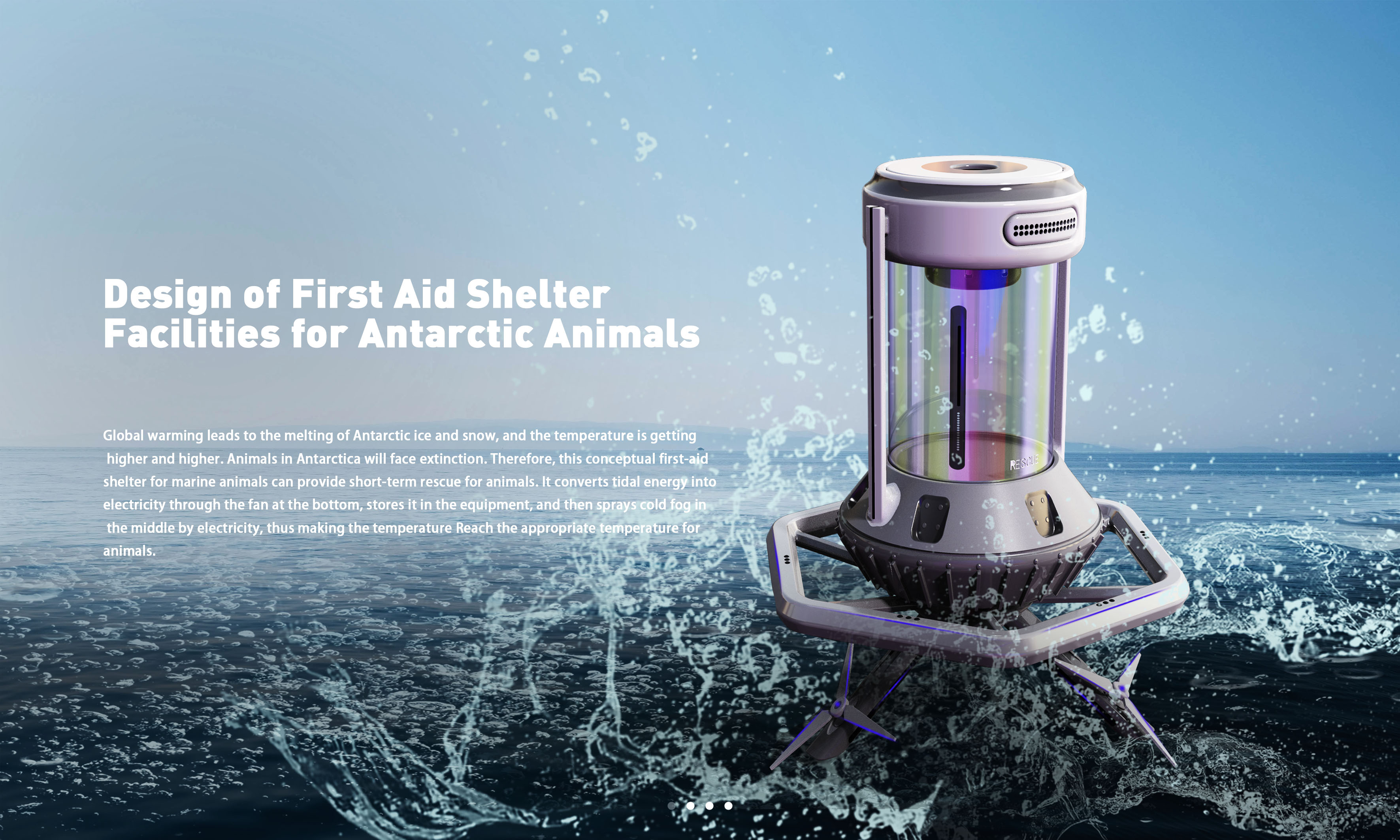 Global warming leads to the melting of Antarctic ice and snow, and the temperature is getting higher and higher. Animals in Antarctica will face extinction. Therefore, this conceptual first-aid shelter for marine animals can provide short-term rescue for animals. It converts tidal energy into electricity through the fan at the bottom, stores it in the equipment, and then sprays cold fog in the middle by electricity, thus making the temperature Reach the appropriate temperature for animals.