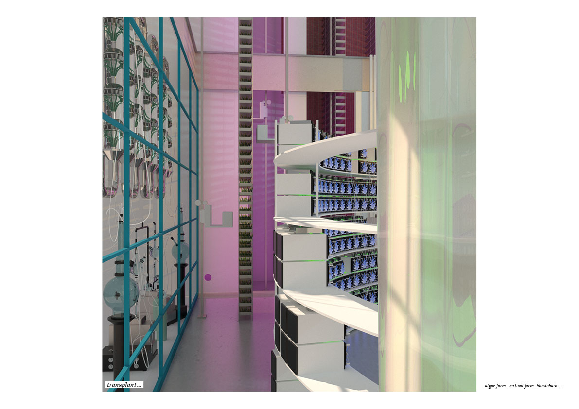 The project is steered by individuals and social groups jacked into P2P infrastructures. Vis Viva is an urban project, retrofitting existing low-rise, low density building fabric. Typologically, is now a high technology energy and agri-food production space that contains infrastructure and systems for Carbon Sequestering – Direct Air Capture, and Carbon Capture Utilisation, Algae Farms, High Density Vertical Farms, a cryptographic exchange, Decentralised Autonomous Organisation (DAO), a data centre, social and entrepreneurial spaces, and a subscription residential service. These are modular assemblies that that plug in to the platform of the city to draw upon underlying services.
