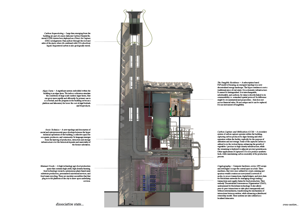 The project and building utilises a defunct power substation in Melbourne, Australia. It is envisioned as a transactional exchange that perpetuates the idea of the city as an infrastructure and hosting environment. These services do not invent new forms or outlines but rather augment and interfere with the source code, the inputs and outputs and didacticism of the city. The project is a representative platform technology that provides a core set of underlying infrastructure services for investment and speculation.