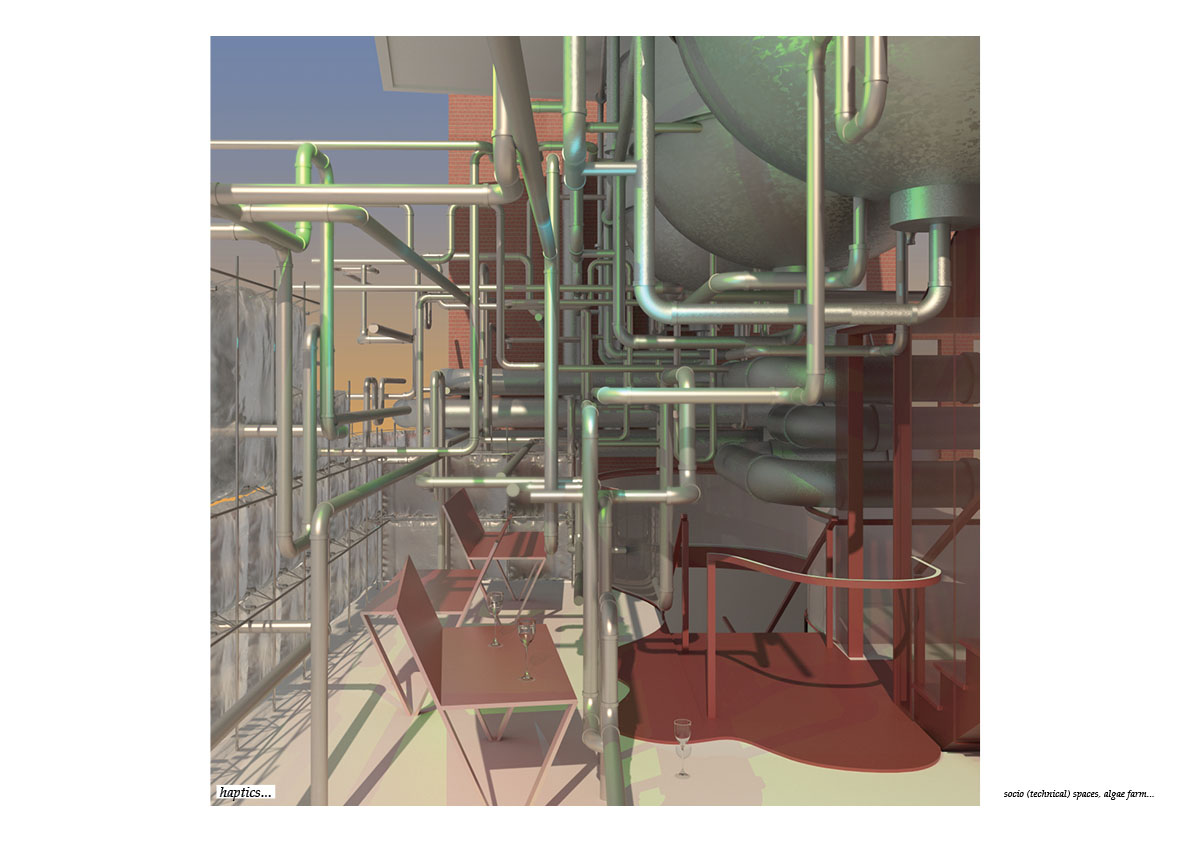 For some time, cities have been completely separated from their productive, industrial legacies – what might it mean to reinstate them and re-establish a link with contemporary urbanism? Vis Viva places itself with the systems of the future city, within emergent sustainable infrastructures and practices. It envisions the city and its built environment as a productive landscape for food and energy. The project is scalable – it can operate at the resolution of a single site or a network across the city block. It brings these distributed even anachronistic variables together within a singular hyper-realistic and hypothetical architectural syntax that seeks to conceptualise a materiality, aesthetic and geometry that these concentrated processes will stimulate. Vis Viva might be recognised as a consummate physical artefact within a discarnate datascape. The architecture is concerned with extending the spaces open to the architectural imagination while engaging with the interplay between intensive practices and extensive forces.
